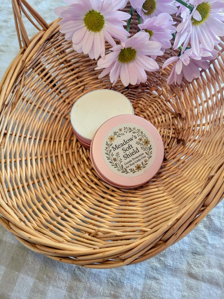 The Meadows Soft Shield is a protective cream designed to comfort and shield delicate skin. Organic chamomile and calendula flowers are slow-infused into tallow, blended with non-nano zinc oxide and beeswax to create a breathable, soothing barrier. Whipped to a feather-light finish, it glides easily over wriggly little ones, locking in moisture and calming irritation.